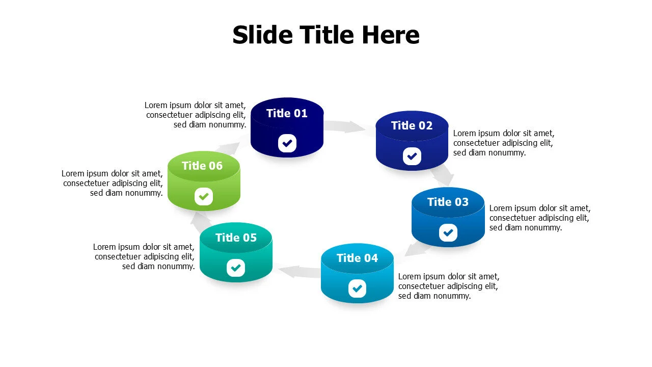 Infographic templates for six 3D cylinder pieces to visualize complex data or multi-step processes.