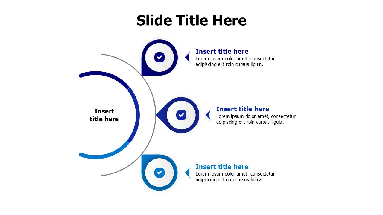 Infographic template showing 3 branching points from a curved line with icons, suitable for workflows, teamwork, and creative processes.