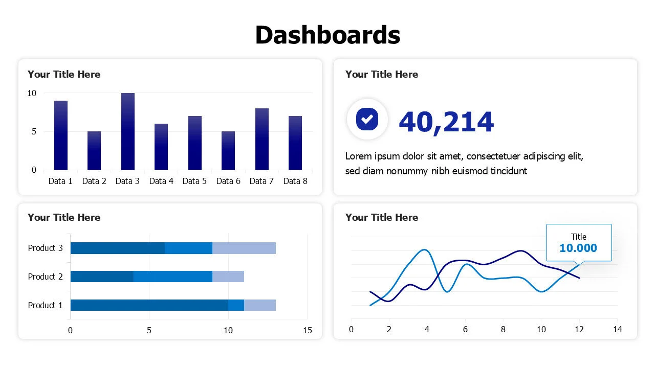 Infographic template with three colorful charts in a dashboard, designed for business presentations.