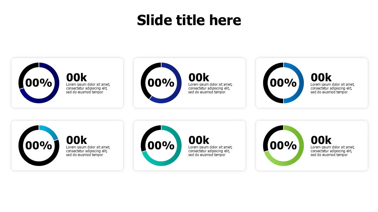 Infographic template with six colorful doughnut charts in a dashboard, ideal for data analysis and presentation.