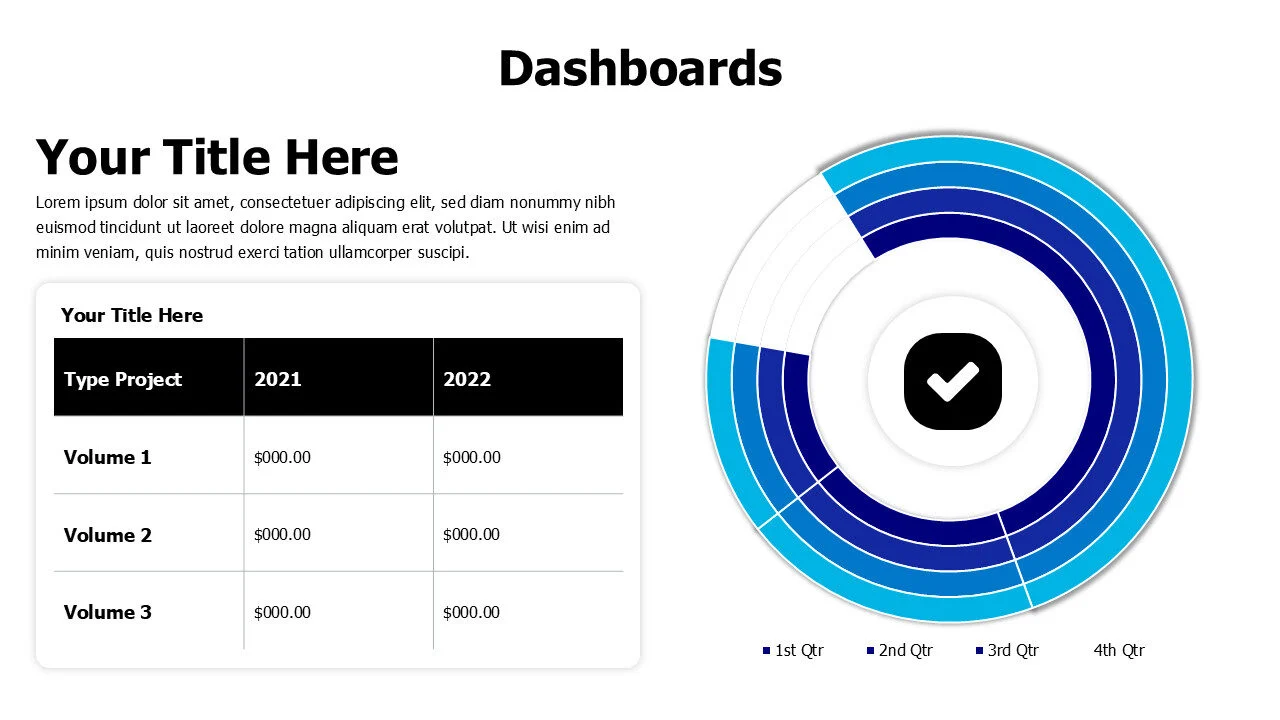 Dashboard infographic template with circular combo charts and a table, perfect for analytics.