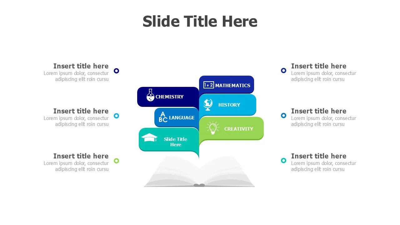 Six-subject book design for comprehensive educational coverage. Multiple topic learning organization infographic template.