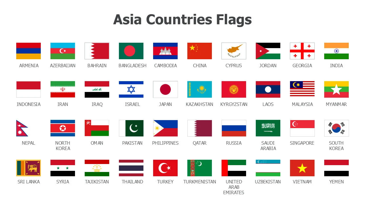 Comprehensive Asian flags compilation for continental studies and presentations. Ideal for cultural diversity and global education topics infographic template.