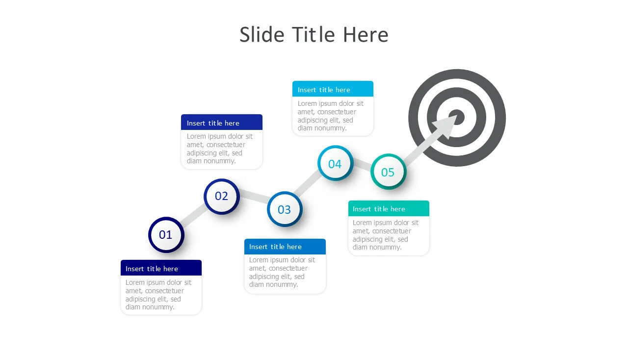 Five-stage goal journey for comprehensive achievement pathways. Ideal for complete objective realization processes infographic template.