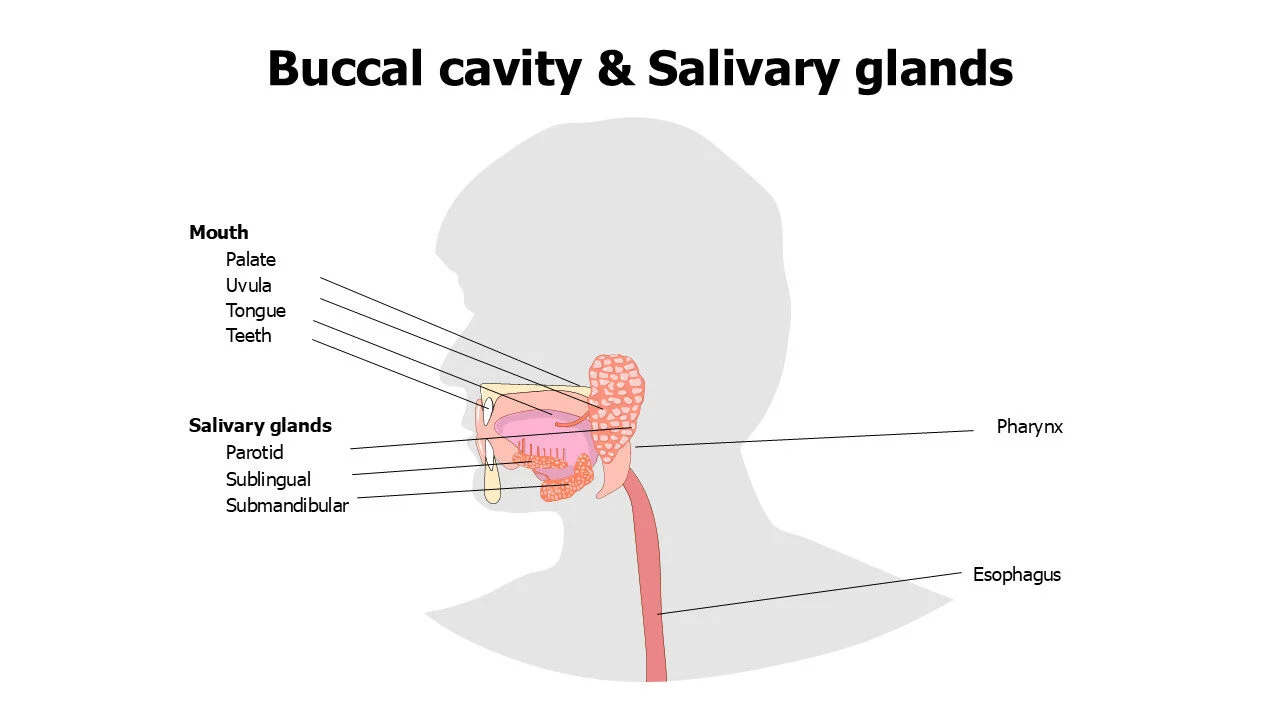 Buccal Cavity & Salivary Glands Slide. An detailed oral anatomy diagram showing the mouth and major salivary glands.