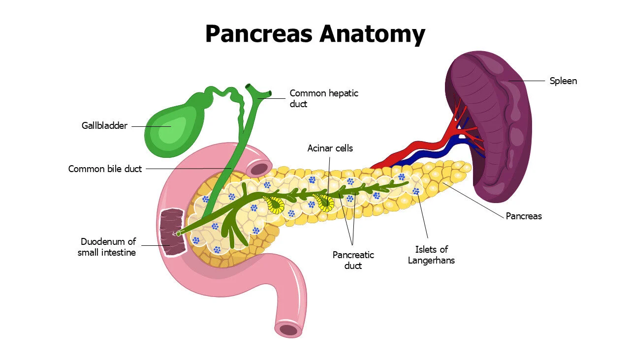 Editable medical illustration slide for Pancreas Anatomy with Gallbladder and Spleen.