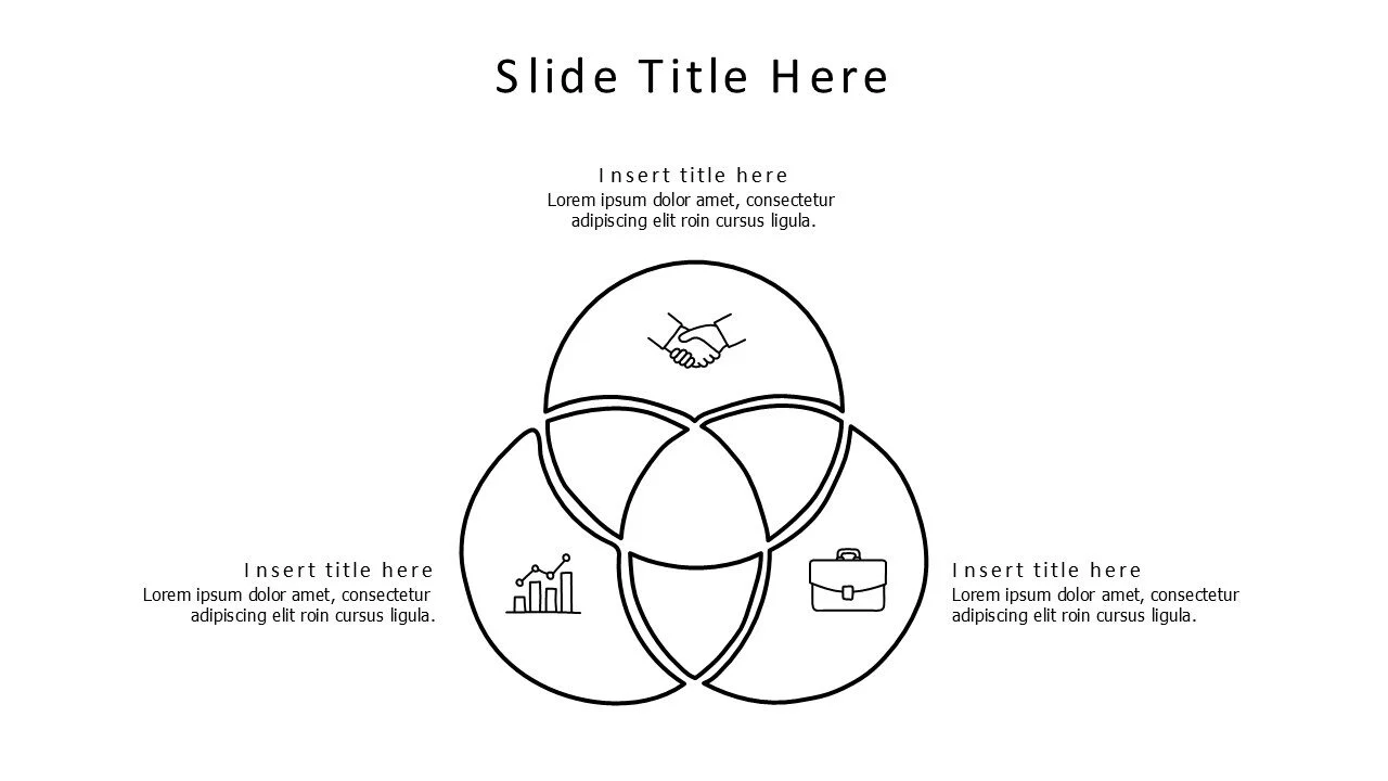 3 Outline Circles with Shared Area. A minimalist triple Venn diagram, using outlines to define the shared and unique spaces.