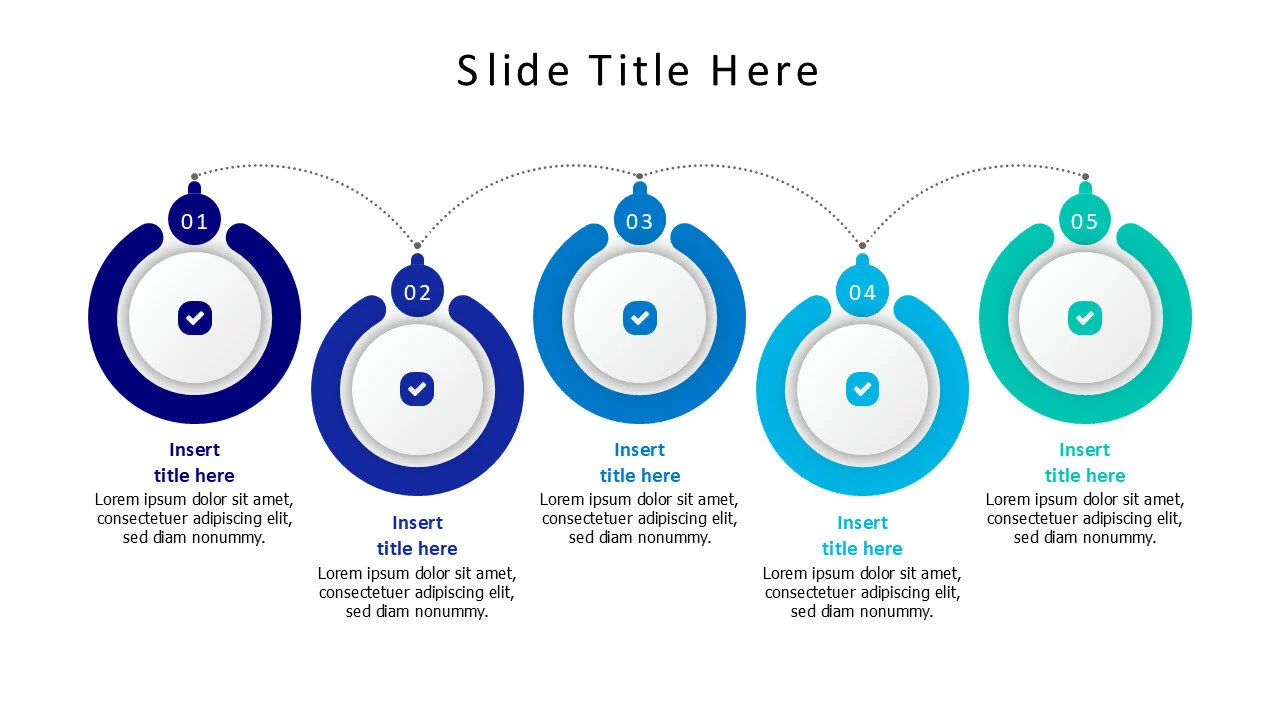 5 Circles Connected by Dotted Line Infographic. A suggested path or less rigid connection between five related ideas.