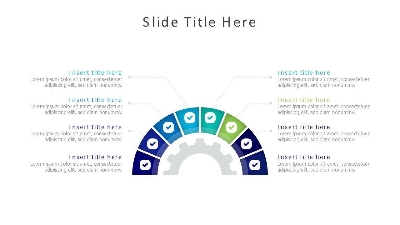 8 points half-circle around gear infographic template for visualizing processes, systems, workflows, and interconnected operational stages clearly.
