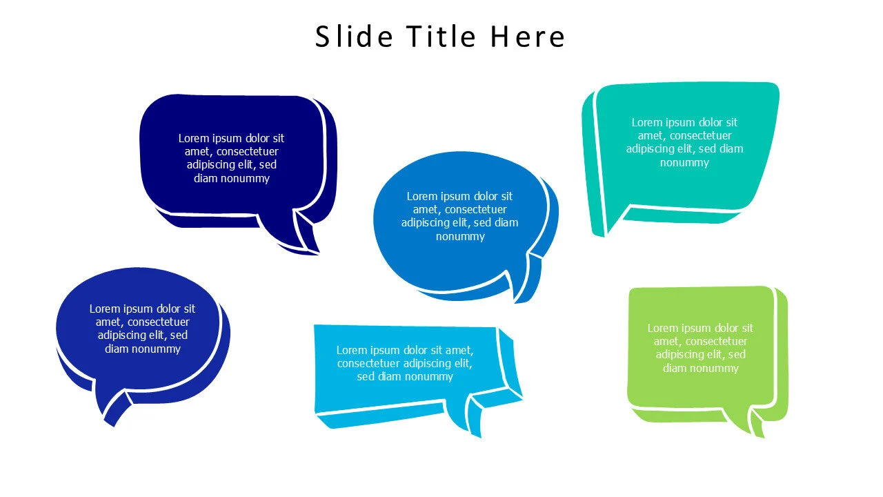 Six speech bubbles infographic template for displaying multiple messages, conversations, or dialogue clearly and effectively