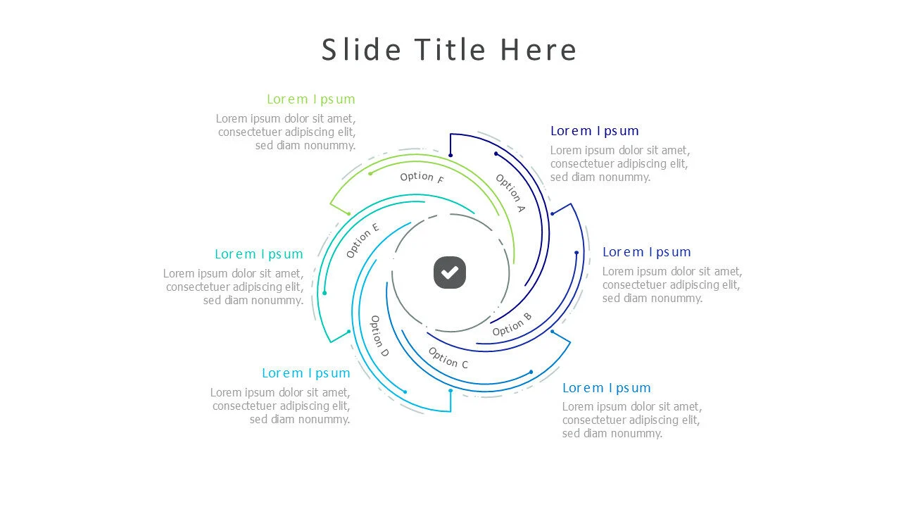 6 points spiral infographic template for professional presentations showing workflows, stages, or iterative processes.